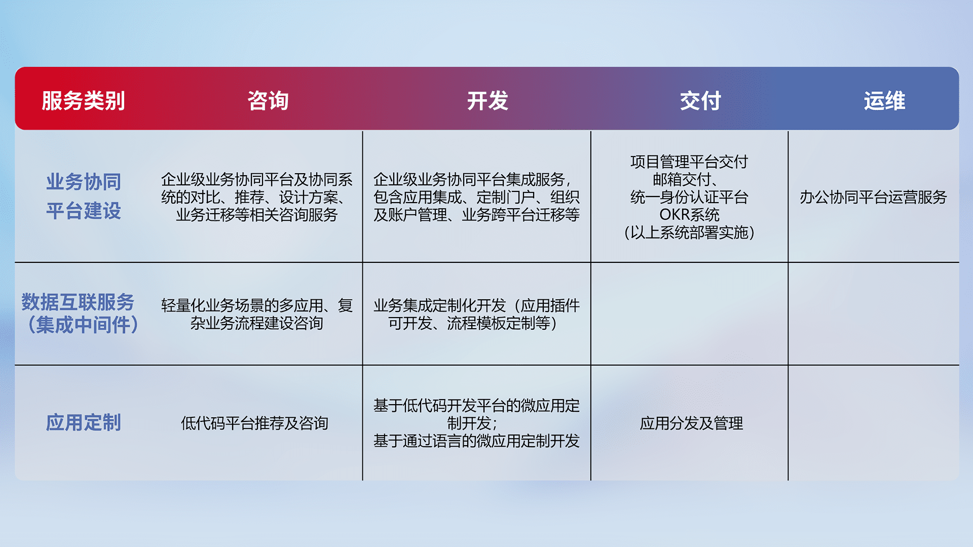 针对钉钉、、、、企微、、、、IDaas等平台级产品提供产品的规划、、、、方案、、交付、、、、定制化开发等服务,,,,实现如统一协同办公、、智能客户服务、、、混合会议管理、、、智能数据查询、、等业务场景,,实现数字化转型。。。。
